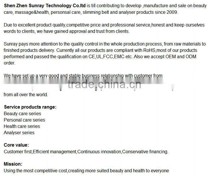 Shenzhen Sunray Tech Co.,Ltd is a Leader manufacturer of portable beauty care, massage, slimming belt, personal care and analyzer products. 7 years ago, we developed the FIRST portable thermage(SF-1209) in the world! Since then, portable thermage Popular global. With 7 years of development, we now have become a very professional industry & trade enterprise. We have our own factory and a mature research and development team with 15 members. We are located in famous "China electronic production centre'-SHENZHEN. The transportation is very convenient (2km away from SHENZHEN Airport, 20km away from SHENZHEN port). Our company has a building area of 20,000 square meters and more than 200 employees. All the products pass the CE,Rohs,UL,FCC,GMC certificate. "Top quality and top service for a reasonable price" is our motto. By offering the best service, the latest technology, excellent money value and impressive range of fitness products, we have satisfied millions of customers,and becoming better and better!