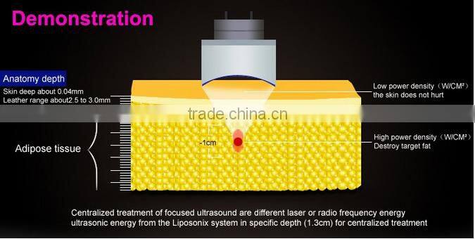 High Intensity Focused Ultrasound penetrates focused and volumetric ultrasonic energy at precise depth. (13mm) in subcutaneous fat layers targeting fat tissue causing a non-thermal effect. The surrounding structures such as the epidermis, blood vessels and nerves will not be damaged. Meanwhile the metabolized contents (triglyceride, fatty acid) of cells will excrete outside body automatically through blood circulation and lymphatic drainage without harm to the human body.
