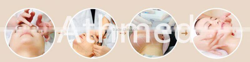 Use high energy ultrasound focusing the treatment position, so that the skin tissue create the thermal, and make high-speed friction cells to stimulate collagen. Such heat effect will not hurt the epidermis, because the treatment fast and direct access to the treatment site within 0-0.5 seconds, without touching the surrounding tissue and can be passed directly to the superficial tendon membrane system (SMAS), so it can be done firm skin while pulling the muscle layer, thin face up to the progressive effect.