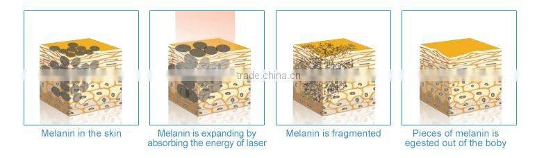 After aborb the heat, the pigments swell and break down, some pigments ( in skin-deep cuticle ) fly off the body immediately, and other pigments ( deep structure ) break down then become the tiny granule can be licked up by the cell, digested and egest from the lymph sell. Then the pigments in ill structure lighten to disappear. Moreover, the laser do not damage the around normal skin.