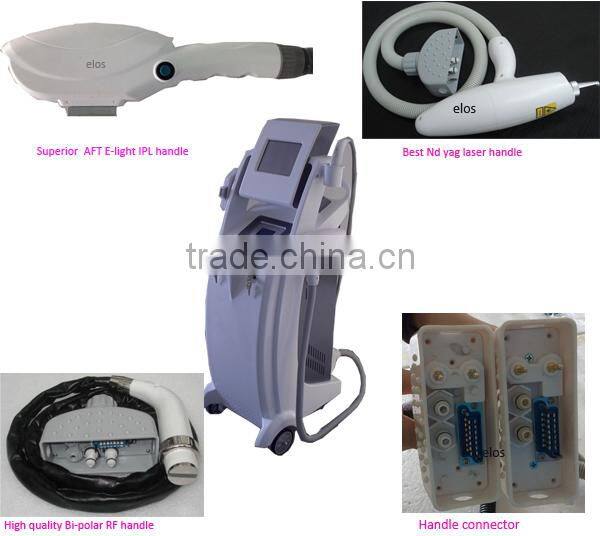 | Handles | 3 pcs: E-light IPL handle,Bi-polar RF handle,Nd-yag Laser handle | |