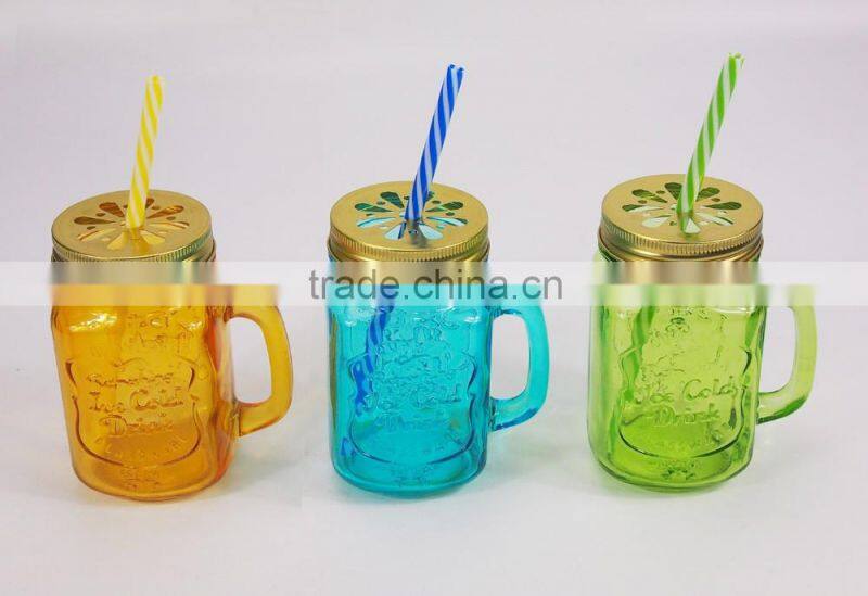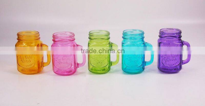 450ML Beverage Embossed Colorful Glass Mason Jar With Handle