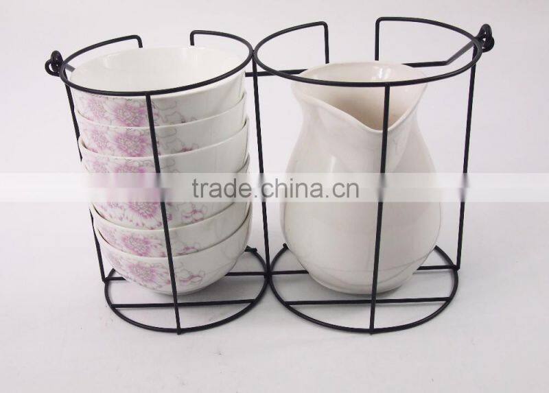 Set of Pitcher and 6pcs Bowl With Metal Rack,ceramic Bowl Set