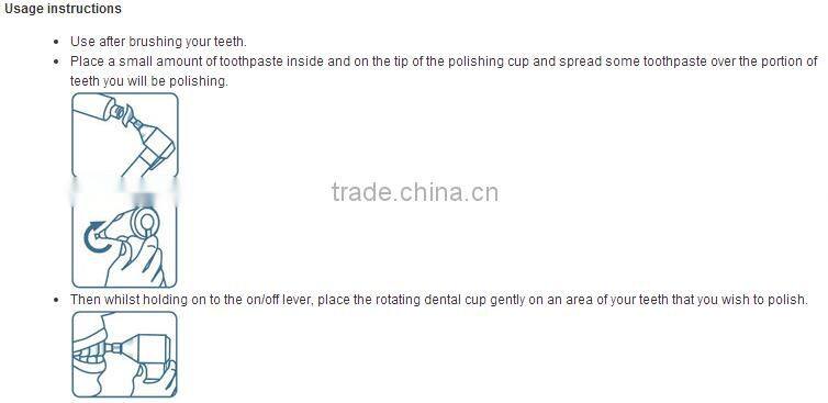 Powered rotating eraser action effectively removes surface stains from teeth caused by smoking,drinking ,coffee,tee,red wine and food.
