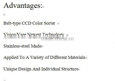 C. Higher sorting accuracy. The belt structure makes the transmission smooth and stable without jumping of material. Belt sorting machines are designed friendly for color recognition, thus ensuring a higher sorting accuracy and lower carryover ratio. It has advantages of both high processing capacity and sorting accuracy and keeps a minimum broken ratio on materials. Vision supplies customized sorting solution as per your request.