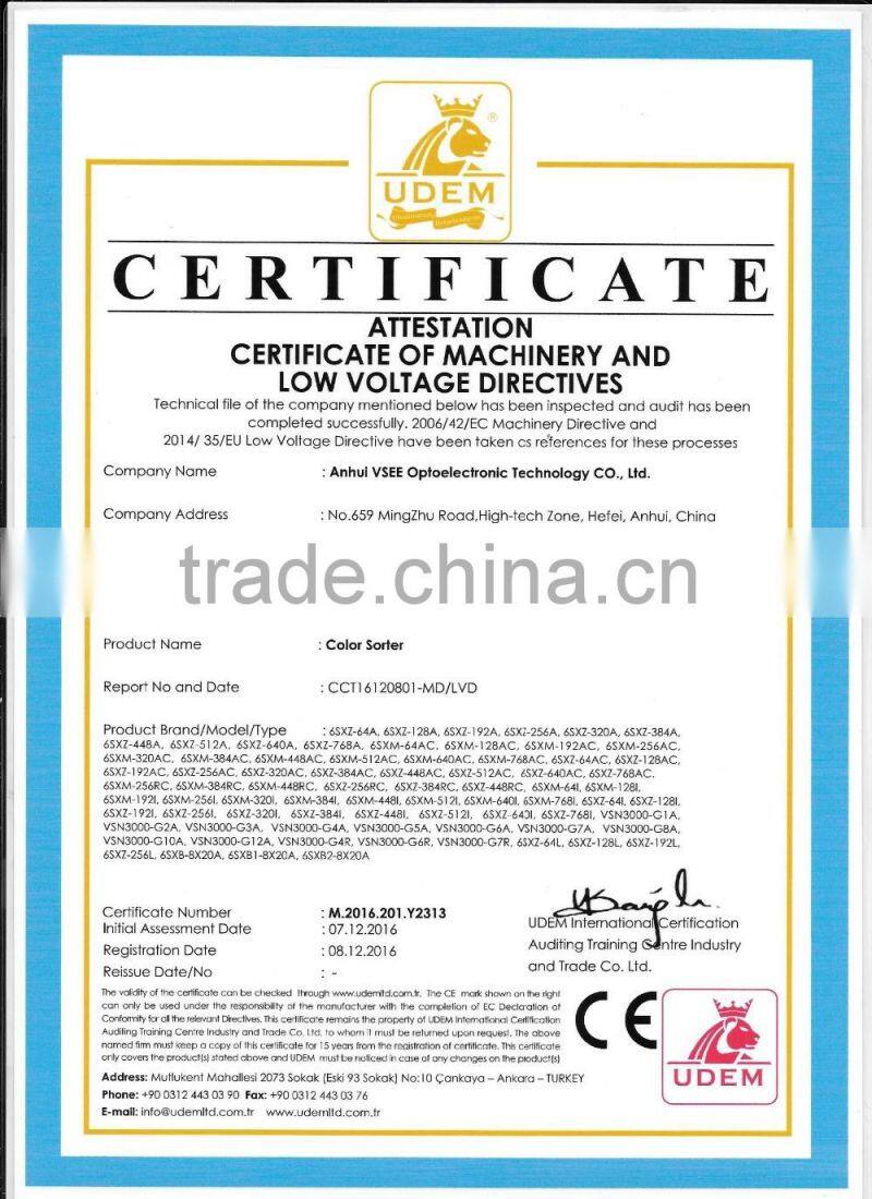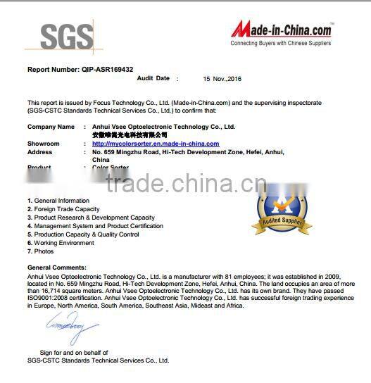 Anhui vsee optoelectronic Technology Co., Ltd is a high-tech enterprise engaged in research, development, design and manufacturing of food and industrial color sorting equipments. The company has a strength R&D team which has been working many years for optoelectronics color sorter and CCD color sorter study, and possesses rich practical experience and strong research and development capability, especially with technological advantage in digital optoelectronic detection represented by CCD sensor. The monochrome CCD color sorter researched and produced by our company is in leading status in domestic industries, and the color CCD color sorter initiates domestic market.Under ISO9001 and ERP System,we fullfill standard management,and certify our products under SGS and CE.