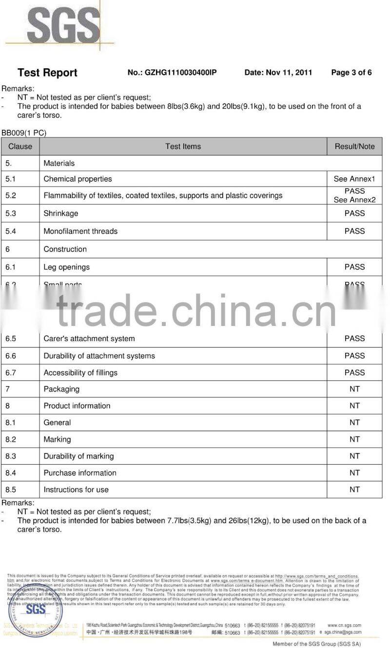 As a serious manafacturer of baby carrier, we put safety at the first place, all of pur products have pass SAFETY TEST BY SGS OF EN 13209-2:2015 AND ASTM F2236-13&CPSIA.