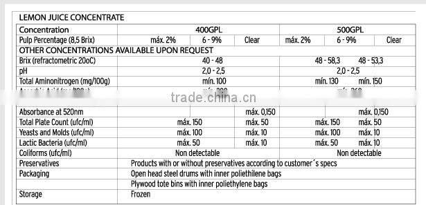 Product: Concentrated Lemon Juice 400 GPL, ultra filtered, with preservatives according to customer requirements.