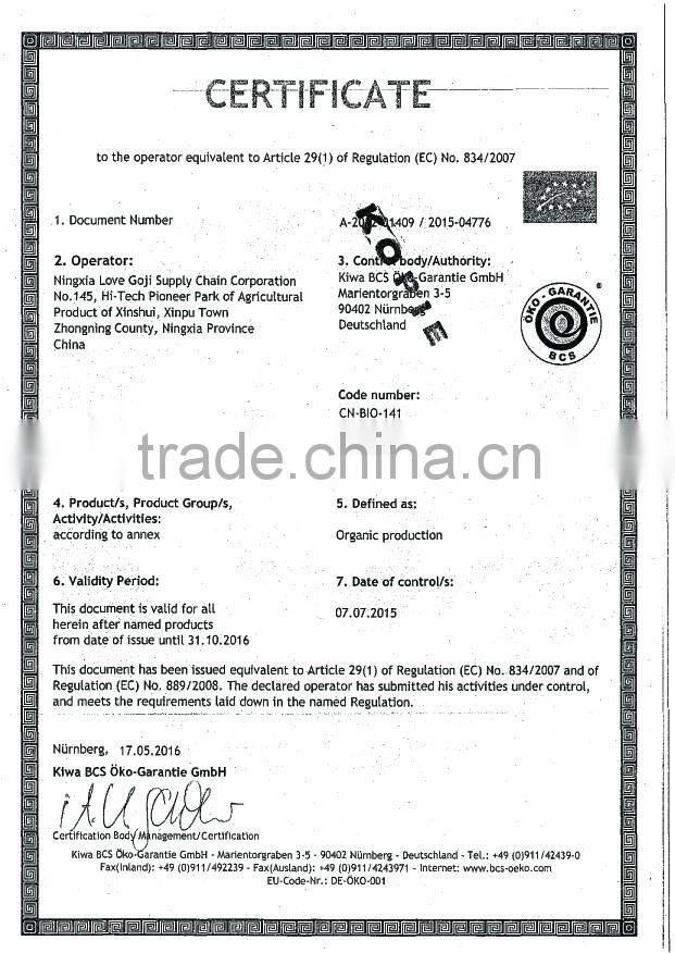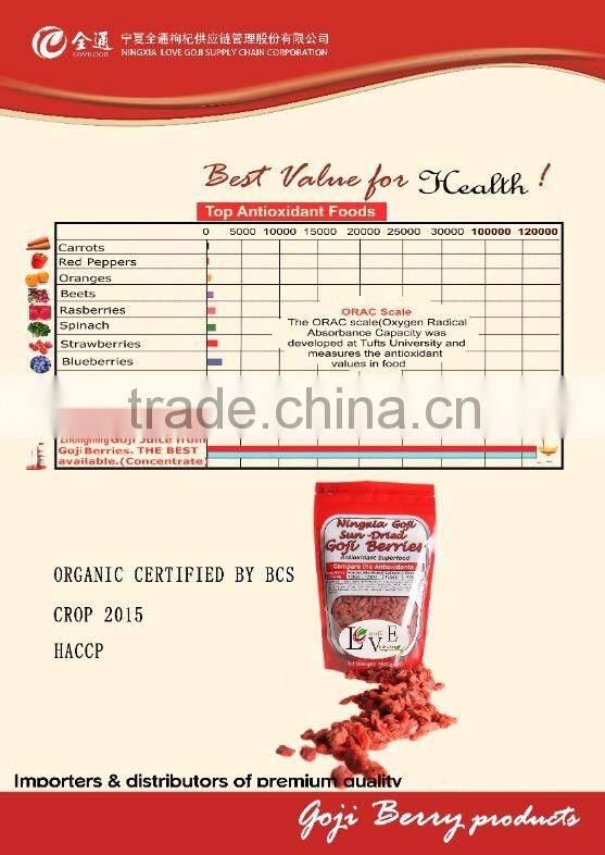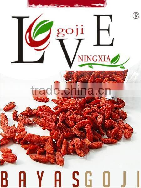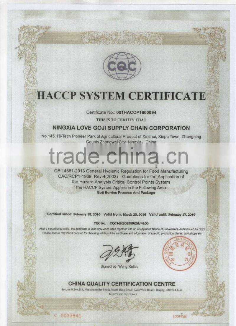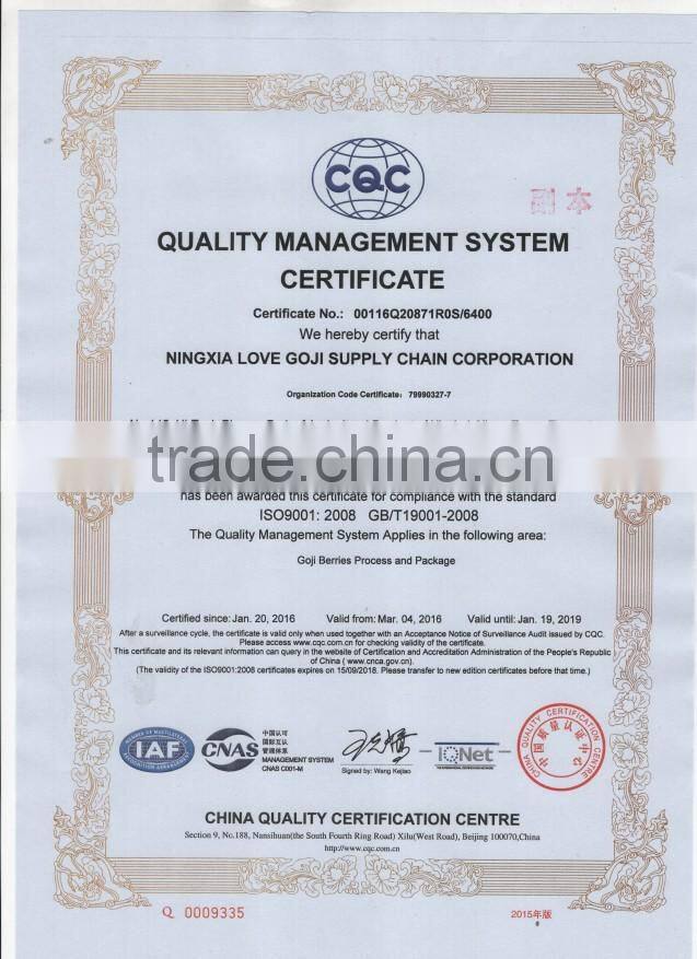 With 13 years of export experience along with excellent quality, advanced services and competitive prices, NINGXIA LOVE GOJI has won numerous customers' trust and support. Our company owns 20,056mu (1mu = 666.7 square meters) of pollution-free organic Goji planting base, and 1,900mu of GAP cultivation base. Our annual output of organic Goji products is10000 tons, which is in line with European and American organic standards.Our factory covers an area of 80,004 square meters, including comprehensive office building of 10,080 square meters for research and development, standardization workshop of 3,120 square meters for bactericide, steam drying and packaging, and enclosed workshop of 2000 square meters for Goji berries.
