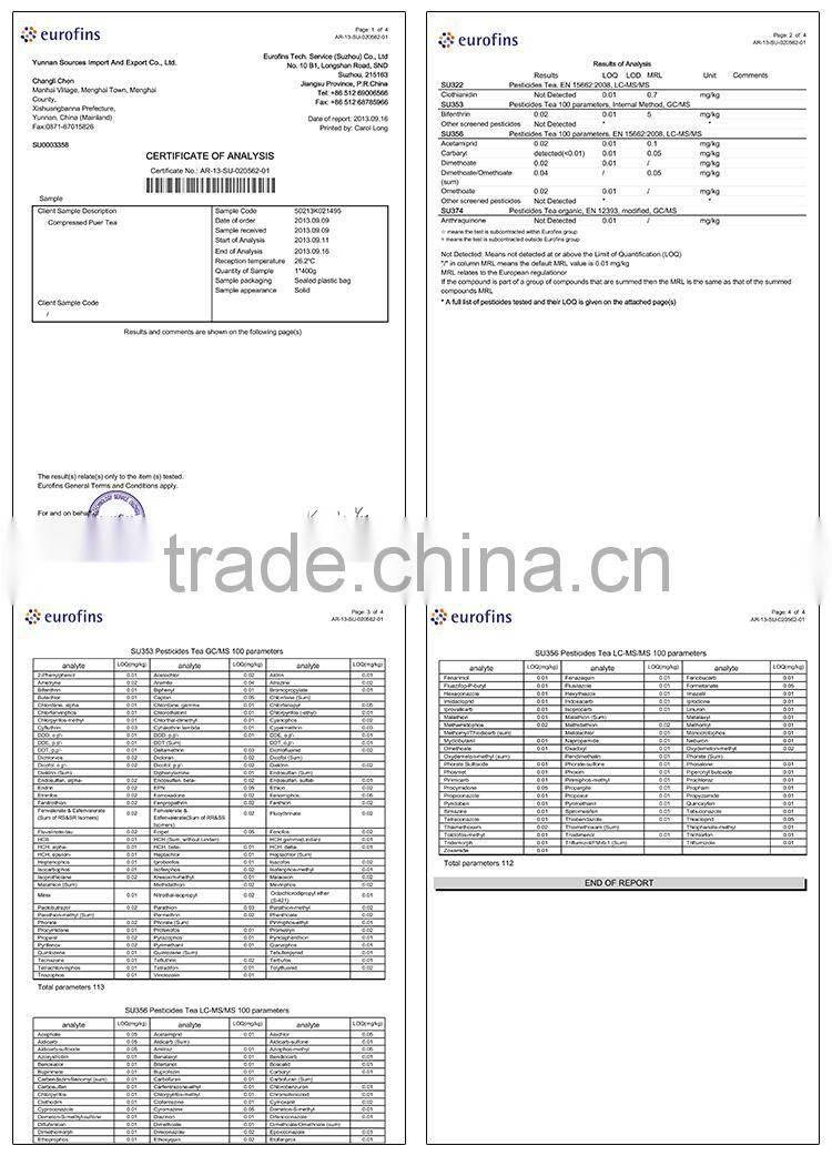 Our tea shipped to Europe must be tested at Eurofian lab to meet EU minimum pesticide residue level before shipping.