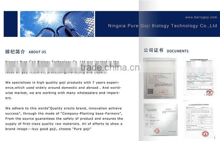 Ningxia Pure Goji Biology Technology Co.,Ltd was located in the heart of Chinese goji growing region.It is a integrated company focus on goji research,processing,marketing and export. The main products include Conventional/Low Pesticide/Organic Goji Berry,Black Goji Berries,Goji Juice & Concentrate, and Goji Powder .ect with Private Brand.