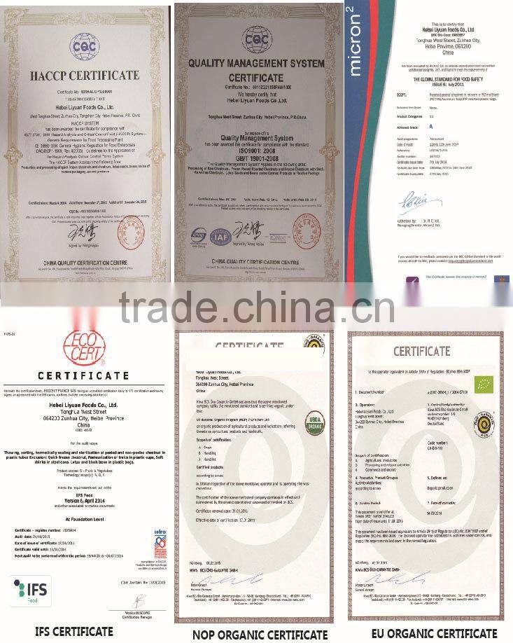 Product Feature | 1, Chestnuts from this region are rich in Vitamin A, Vitamin B, Vitamin E and other important minerals 2, From the Tree to the Consumers, produced at Hebei Yanshan Mountains which is the best quality chesnuts of China. 3, Organic chestnuts certificate by JAS USDA, BCS 4, 100% natural & health food without any additives and pesticide residue | |||