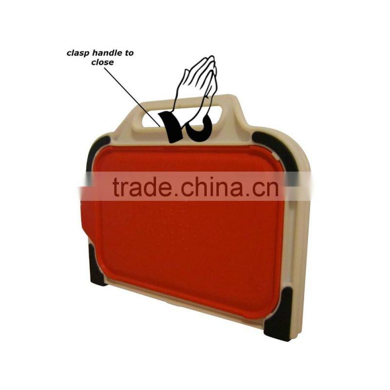 A beautiful combination of 3 perfect sized cutting boards plus handle for convenient carrying, briefcase style, practical & clipped together great for every day use, big & small quantities, a must for every kitchen! also great for those who travel, to take along this briefcase style board which will make slicing your beef for your barbecue very easy.