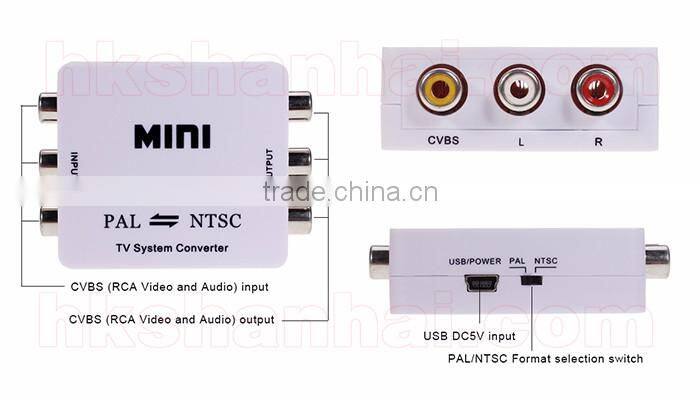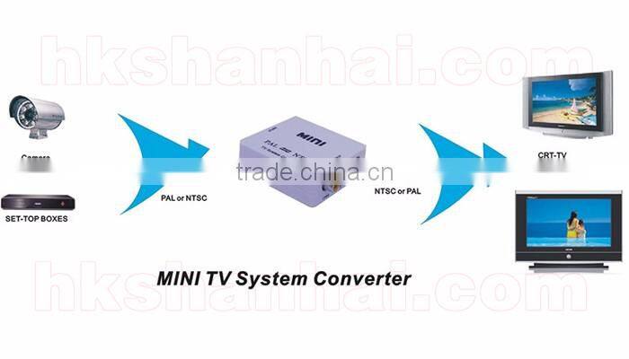 The MINI TV System converter designed for the single-format video equipment (such as NTSC TV sets, projectors, PDP, projection, etc.) to achieve other format which show on TV. It digital transfer device using the most advanced all-digital way on TV and video format for processing, powerful functional and superior performance of the feature from many kinds of video signal formats (Including PAL, PAL60, NTSC3.58, NTSC4.43, SECAM) unified converted into PAL or NTSC standard signal output (as required by the user settings).