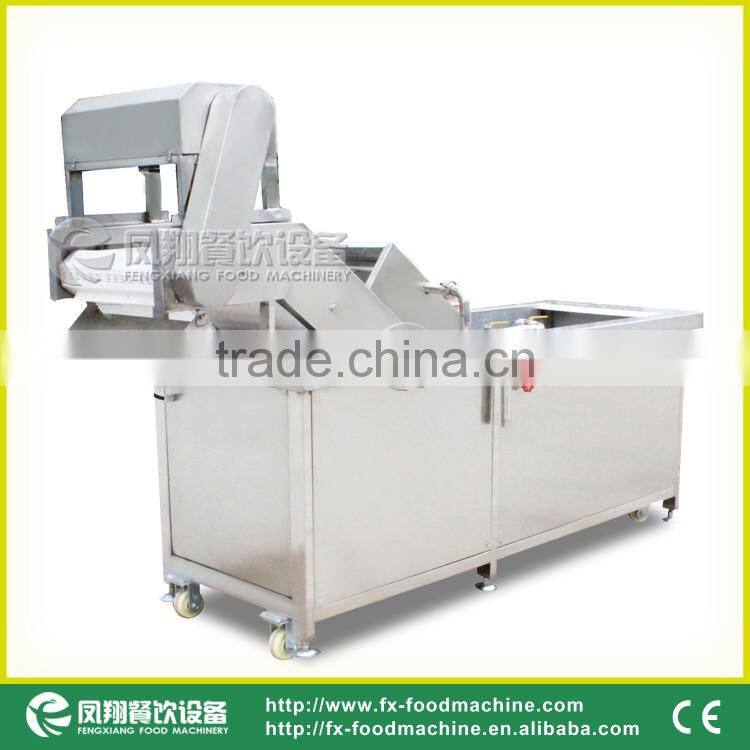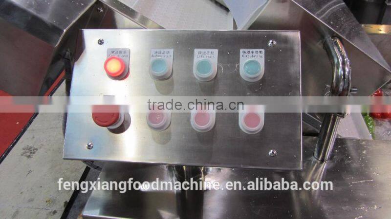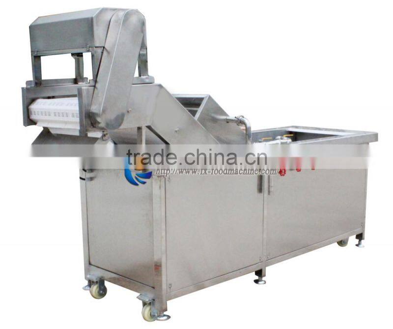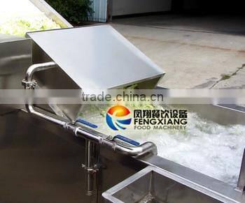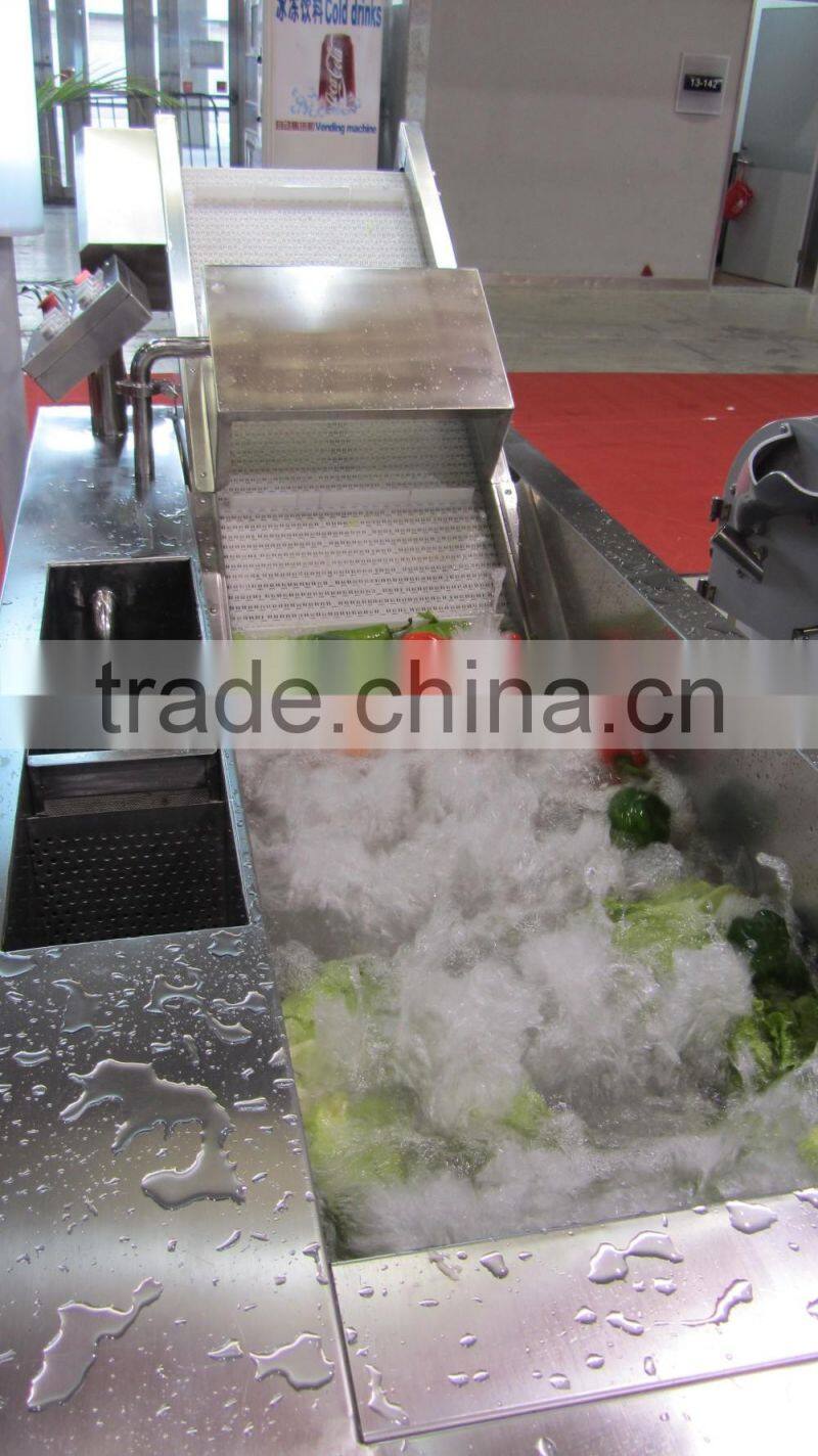 The water is bubbling to wash the vegetables. and there is high pressure air flow the wash them clearly. After washing , the vegetables would be pushed to the conveyor belt by the strong water flow .