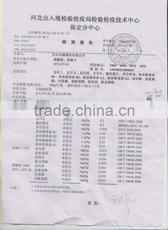 All of our products are nature green red chili, without any pesticide residue, NO speckle, mould, sudan red 1,2,3,4, Aflatoxin, Salmonella, Heavy metal.