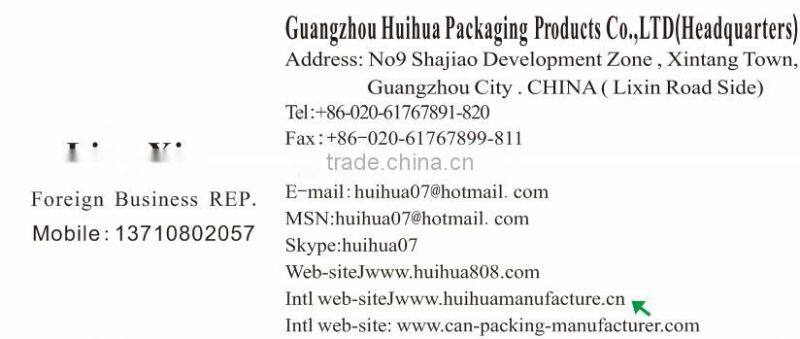 2). top with aluminum easy open end or aluminum peel off end, and plastic PE lid(any color), tinplate lid or plastic lid, bottom withironaluminum cap(yellow,white or black)or PP plug,several structures for chose.