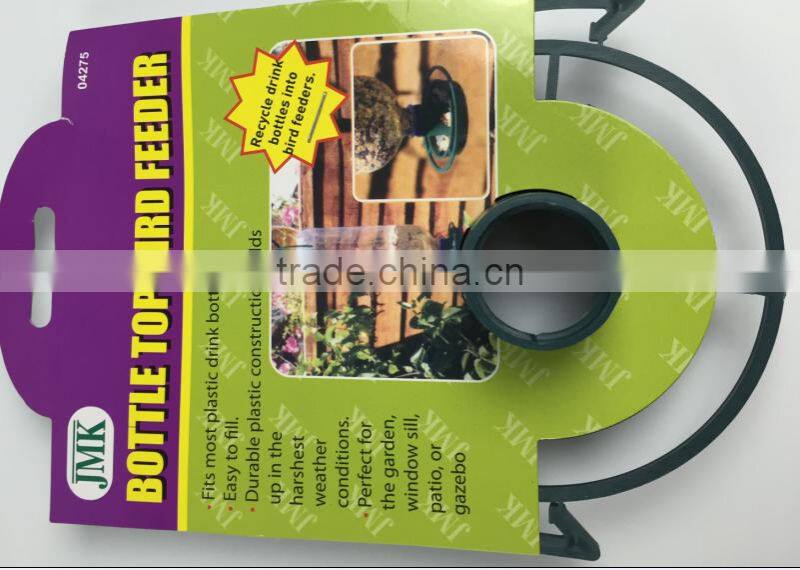6.Insert the hanger ends into the two holes; fill with bird seed and twist the feeder tray on the bottle top, hang and enjoy