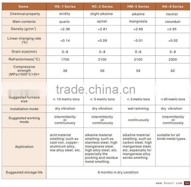 | Application | acid material smelting; such as cast iron, copper-aluminum alloy, low alloy steel, etc. | alkaline material smelting; such as stainless steel, high manganese steel, high alloy steel, etc. especially the pocking and residue metal smelting. | alkaline material smelting, such as carbon steel, high manganese steel, etc, especially for manganese alloy series smelting. | suitable for all kinds metal types. |