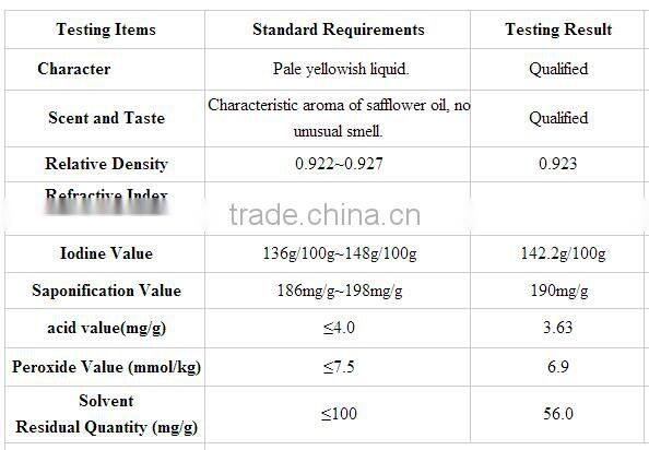 Safflower seed oil as edible vegetable oil has stable bright color and high nutrition. Used for fried and raw mixed with cold dishes as sauces and salads; also used for frozen desserts etc.