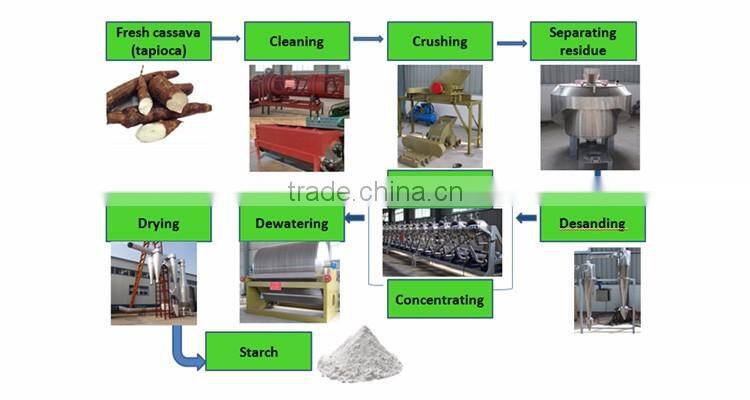 Scraper conveyor, Cleaner and peeler, Paddle type washer #1, Paddle type washer #2, Cager washer, Meshed crusher, Residue conveyor, Filter, Hexagonal Filter #1, Hexagonal filter #2, Desander, Transmit tank, Starch hydrocyclone, Vacuum dehydrator, Starch dryer, Package Machine Ect.