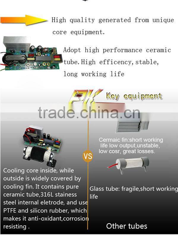 Answer: It uses our company patent ceramic ozone generator tube which is air cooled for both internal