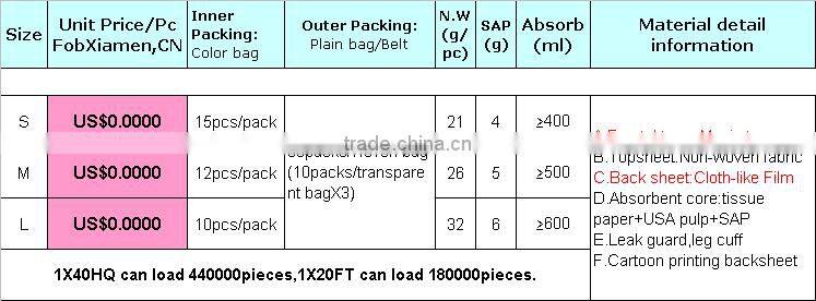 Specs:PE/Cloth-like Printed Film, PP/Magic Frontal Tapes with Leak Guard