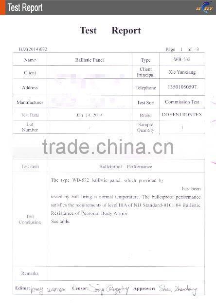 The bulletproof UD sheet is made of UHMWPE Fiber Yarn produced by our company. This product is consisted of two unidirectional arranged fiber webs which overlapped by 90 degrees each other and laminated with special matrix materials by certain technology.