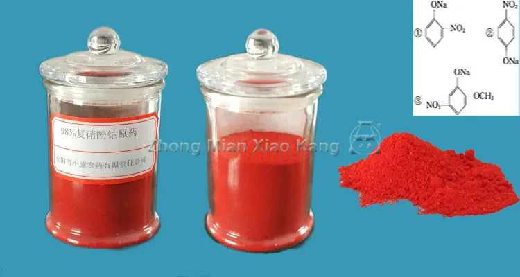 compound sodium nitrophenolate is a kind of plant growth regulator, It can promote crops growth and development,induce to bloom and fruit, break the dormant obstacle, induce to root and germinate, avoid falling blooms and fruits, improve the quality of plant, make the fruit have a good color and quality, raise the absorption of the nutrition, enhance the immunity of the plant ,enhance against drought, flood, coldness, freeze injury and capability, Improve the quality and quantity.