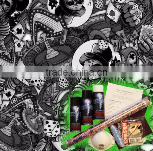 The main process procedure: jigging, base color coating, film activation, spreading film on water, transfer printing, washing and top coating.The newest technology for the water transfer film is used by inkjet printer with water transfer ink and film. Any customized image can be transferred on the objects..