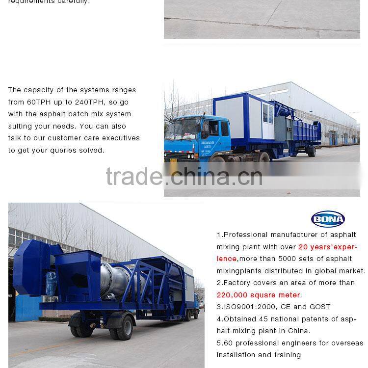Mobile asphalt mixing plant manufactured by Bona, is well designed to give great help in the quick and efficient mixing of asphalt with low dust, which is a best solution to achieve the desired good mixing results of asphalt product. The mobile asphalt mixing plants from Bona are preferred because of its low dust emissions, easy operation and less fuel consumption. the company has manufactured and supplied reliable mobile asphalt mixing plants with excellent performance and acceptable price to clients.