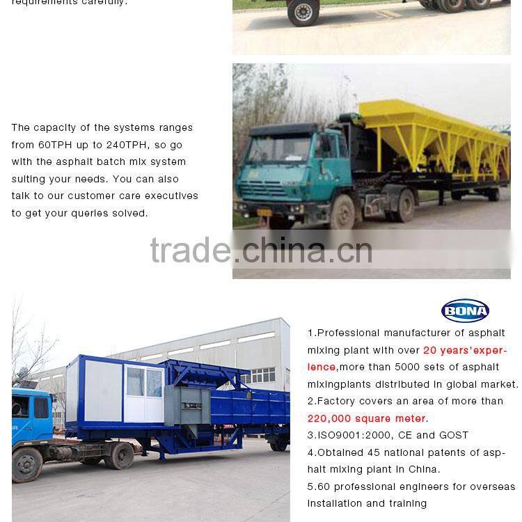 Mobile asphalt mixing plant manufactured by Bona, is well designed to give great help in the quick and efficient mixing of asphalt with low dust, which is a best solution to achieve the desired good mixing results of asphalt product. The mobile asphalt mixing plants from Bona are preferred because of its low dust emissions, easy operation and less fuel consumption. the company has manufactured and supplied reliable mobile asphalt mixing plants with excellent performance and acceptable price to clients.