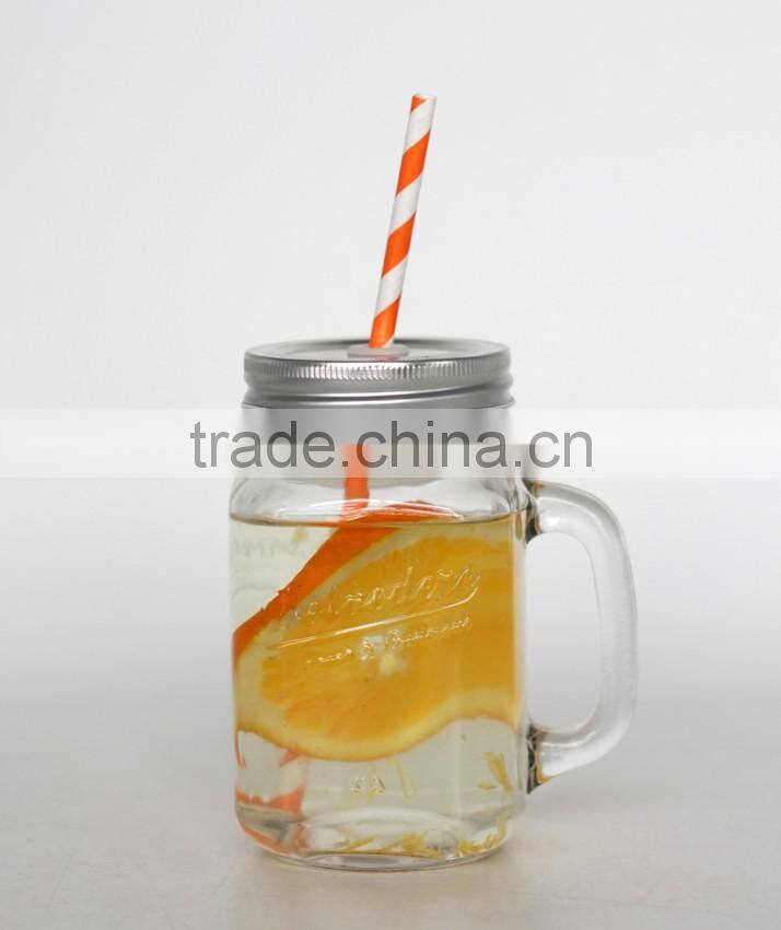 Wholesale Glass Mason Jar With Handle and Paper Straw, Metal Lid 480ML