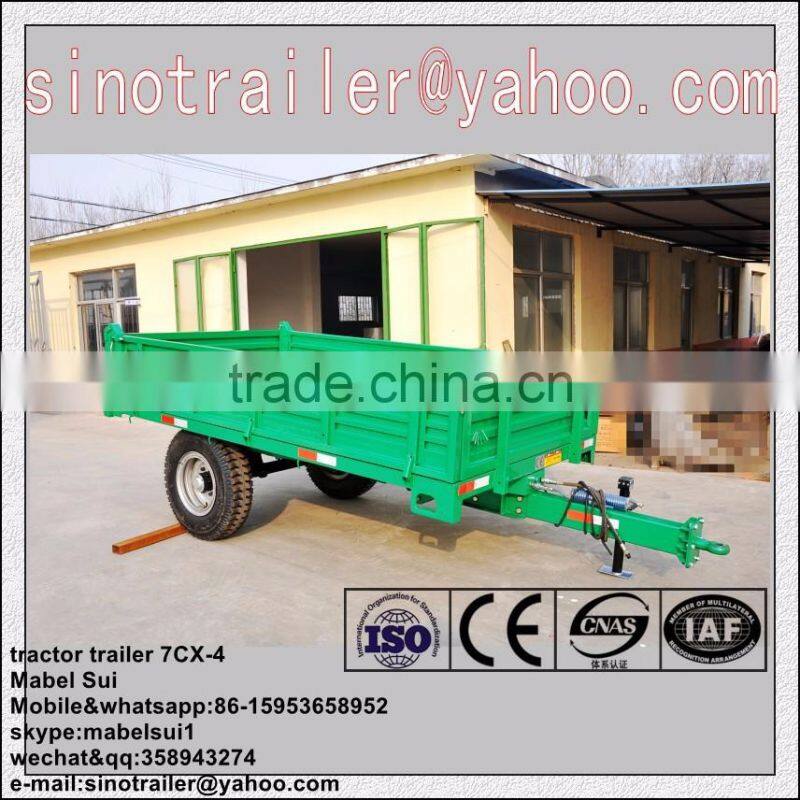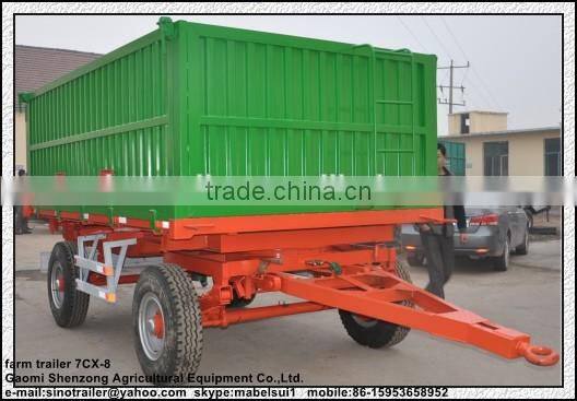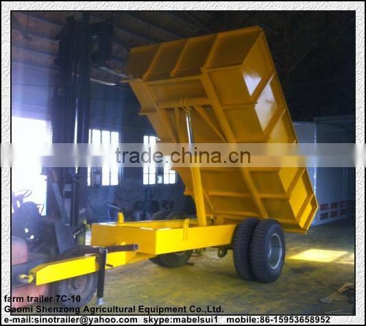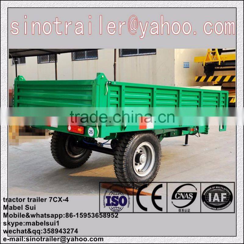 The 7C series farm four wheel trailer applicable for plains, mountains, swamps, hills, farmlands, and highway transportation of different region environment, different kinds of the trailer used together with different types of tractor that make full use of the tractor function. Based on the tow basic type, our company expand production of various types of mechanical and hydraulic auto dump trailer, improve operational efficiency. Small auto dump trailer is backward of tipping; in middle and large dump trailer is lateral or backward tipping with the hydraulic lifting , and mainly is two sides to dump. The trailer adopts whole steel structure, has good matching performance, firm structure, beautiful shape, reliable braking, safe use, stable running, big load potential, convenient maintenance, durability and other characteristics, set farmlands and road transport in a body, is a good tool for the plain, mountain area.