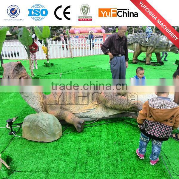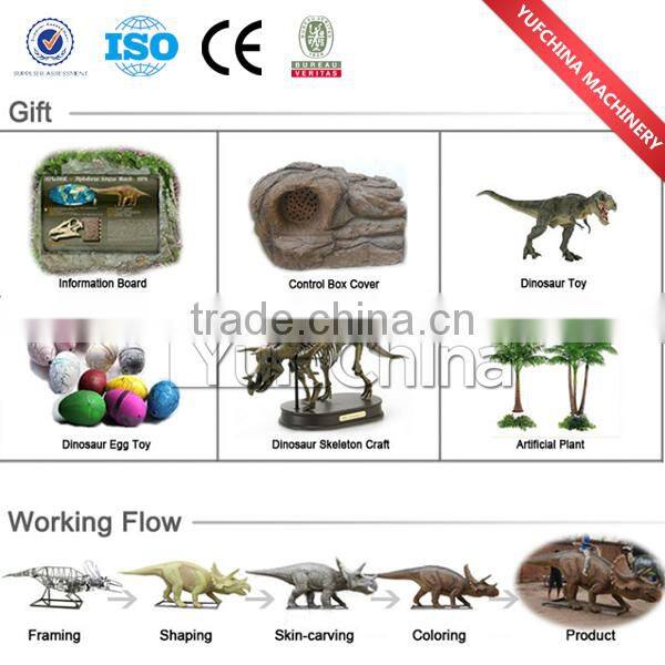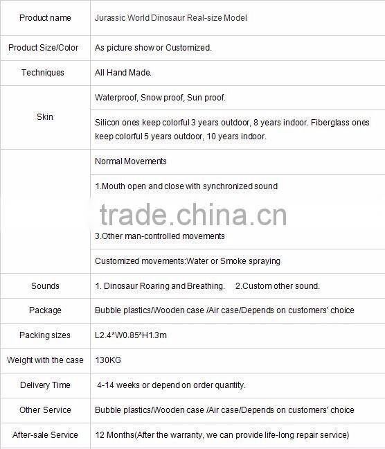 Our real-size dinosaur models are designed for theme/amusement park,outdoor,shopping mall, museum, restaurant etc.All our animatronic dinosaurs and simulation products are made up of well treated metal frame, servo motors driven for movements, skined or fleshed with a high density foam, and manually sculpted and coated by professional artists with a high grade silicon rubber to have an alive-look and touch and flexible movements.And dinosaurs are finally painted with a customer desired color.