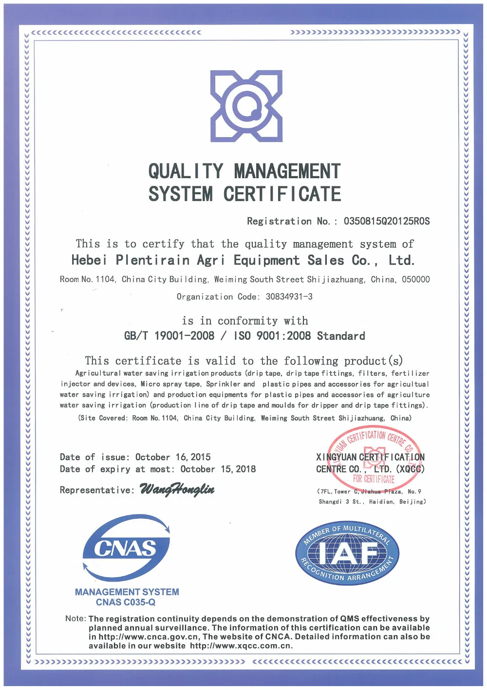 The company has passed ISO 9001:2008 quality management certification: