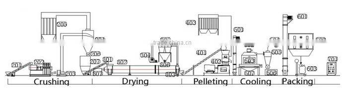 Equipped with professional pellet production line factory, Laizhou Chengda Machinery Co.,Ltd is one of the leading China pellet production line manufacturers. The complete wood pellet processing plant through our research and development is manufactured for produce the wood fuel pellets. Main equipments within it include Crushing process, Drying process, Pelleting process, Cooling and dusting process, Packing process. It has advantages such as compact structure, good appearance, high yield, less consumption, convenient and reliable performance etc. More details, as follows: