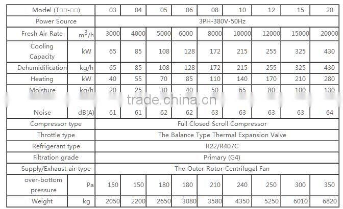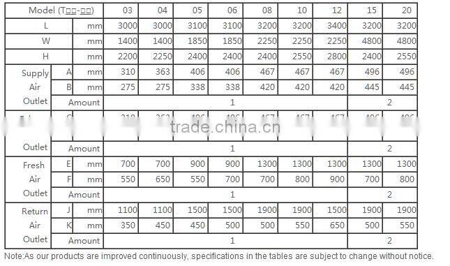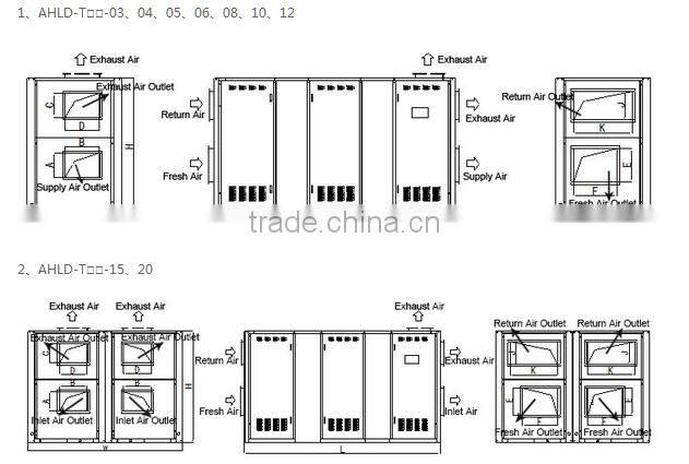 Notes: 1.Nominal cooling and dehumidification working conditions: fresh air dry bulb temperature 36℃, relative humidity 60%,; returned air dry bulb temperature 26℃, relative humidity 60%; supply air dry bulb temperature 18℃, wet bulb temperature 13.3℃. 2. Nominal heating and humidification working conditions: fresh air dry bulb temperature -5℃, relative humidity 50%,;returned air dry bulb temperature 20℃, relative humidity 50%; supply air dry bulb temperature 18℃, wet bulb temperature 13.7.3. The above section and setting are only for reference. Please choose and adjust based on actual project requirement, or provided y customer.