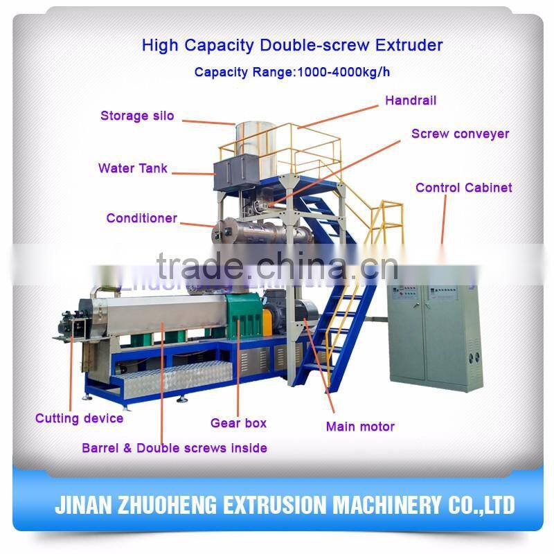 Twin-screw Extruder Unit is the high standard and professional extrusion machinery unit. It’s consist of bucket elevator, Storage Silo, material conveyor, conditioner, feeder, extruder, electric controller and operation platform. The extruder includes drive system, extrusion system, cutting system, heating system, lubricating system and extraction steam system.Conditioner is designed as the advanced technology biaxial differential modulator.