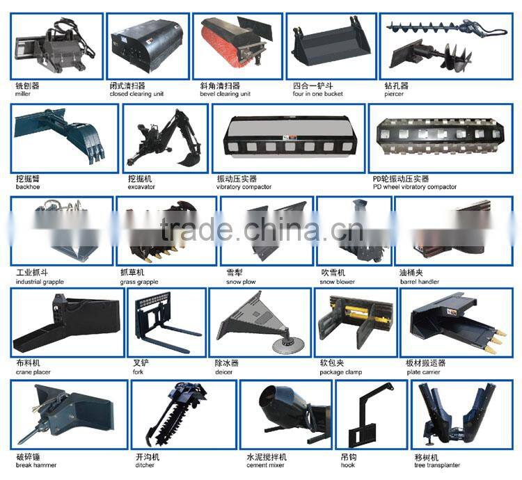 9.Optional attachments:Log Grapple,Rock Bucket,Pallet Fork,Hydraulic Breaker,Sweeper, Single Arm Excavator,4 in 1 bucket,Auger,Trencher etc.Parameters of 23hp mini skid steer loader