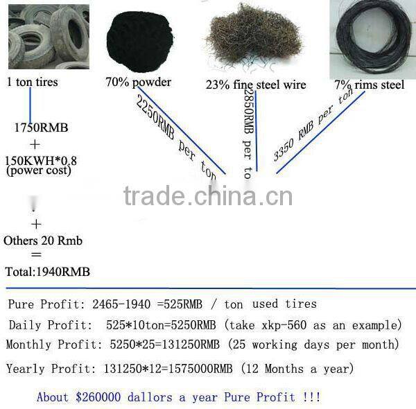 Major flow: Waste tires-circle cutting-strip cutting-block cutting-grind into powder-magnetic separating-separation-packing-put in storage.