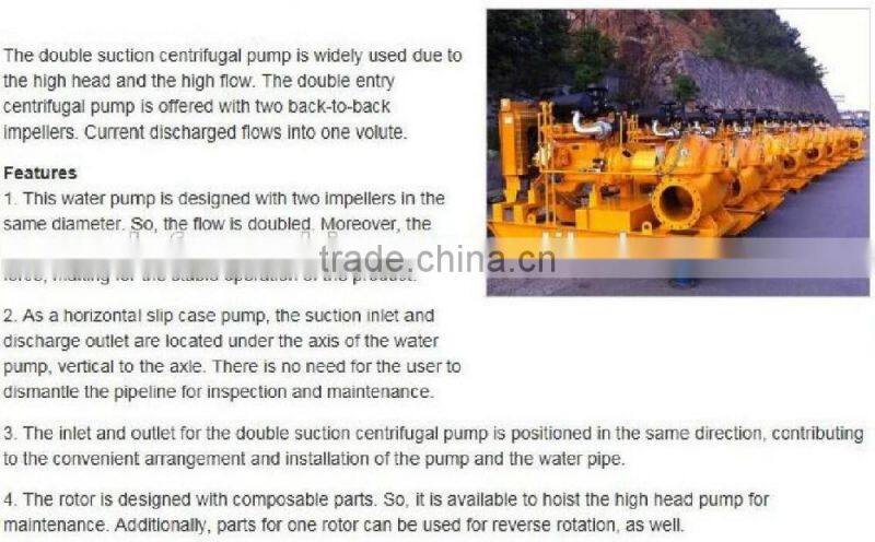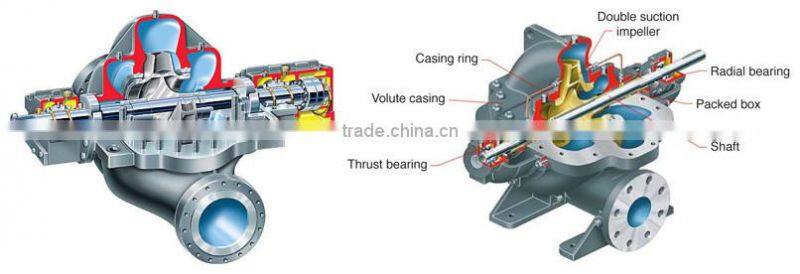2.The double suction centrifugal pump is widely used in urban drainage,urban water supply,water plant,central heating system drainage for power plant,paper mill,water supply for air-conditioning system.For example,the water plant uses pressure pipes for pumping water and equips with water filter to ensure the water quality.