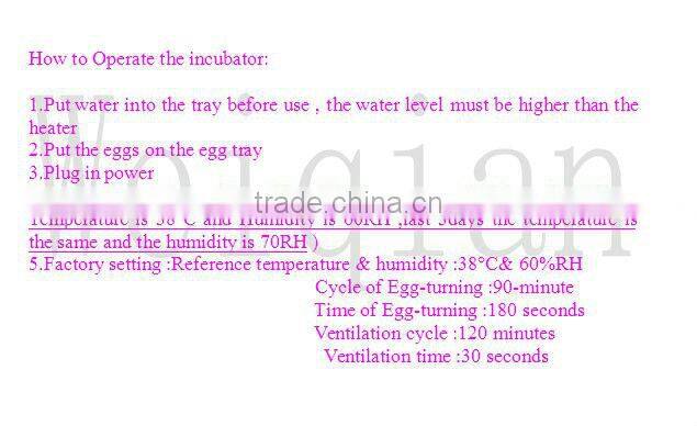 3.the egg turning motor keeps on turning all the time, 6r/per day! It will increase the hatching rate