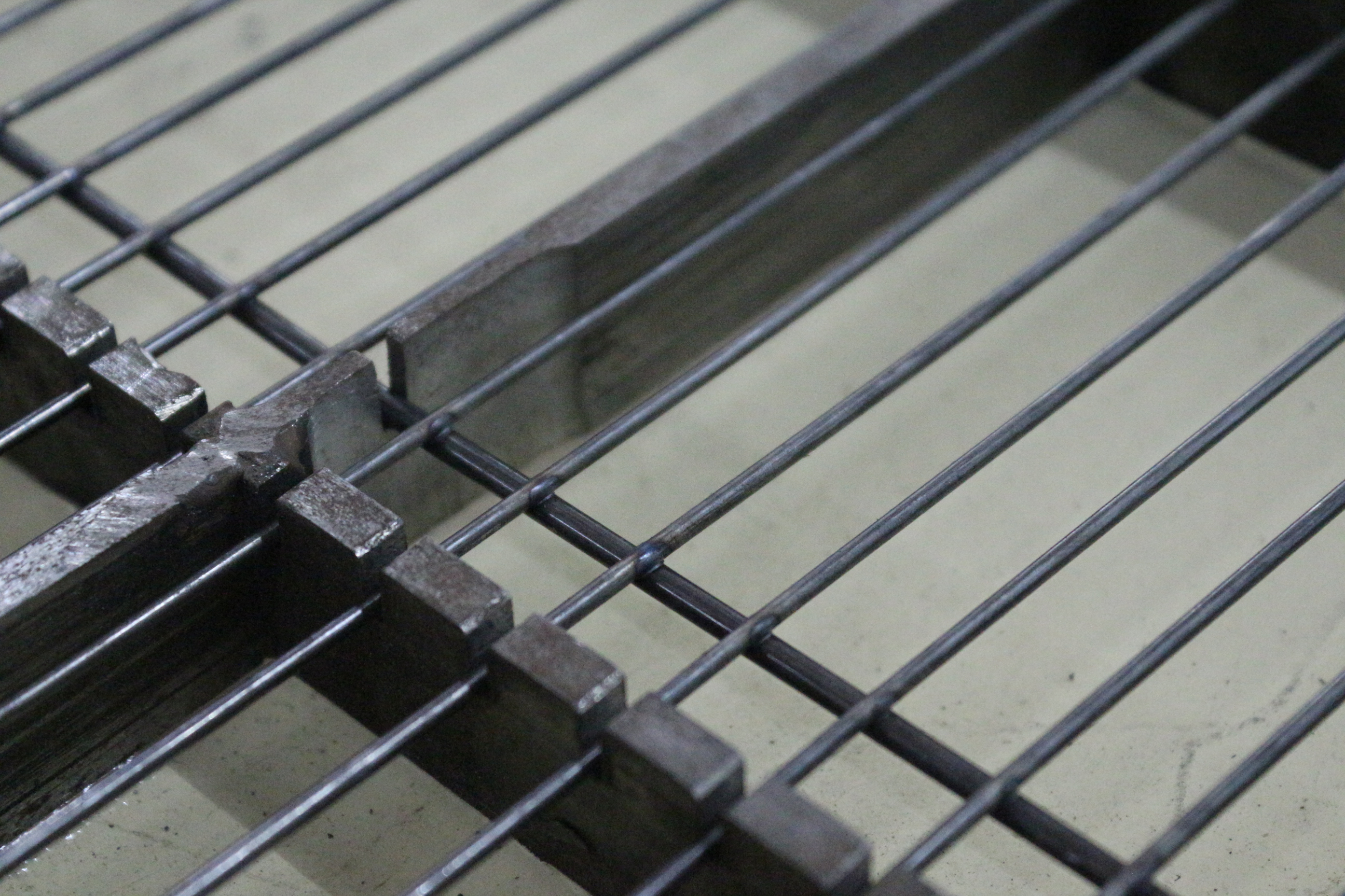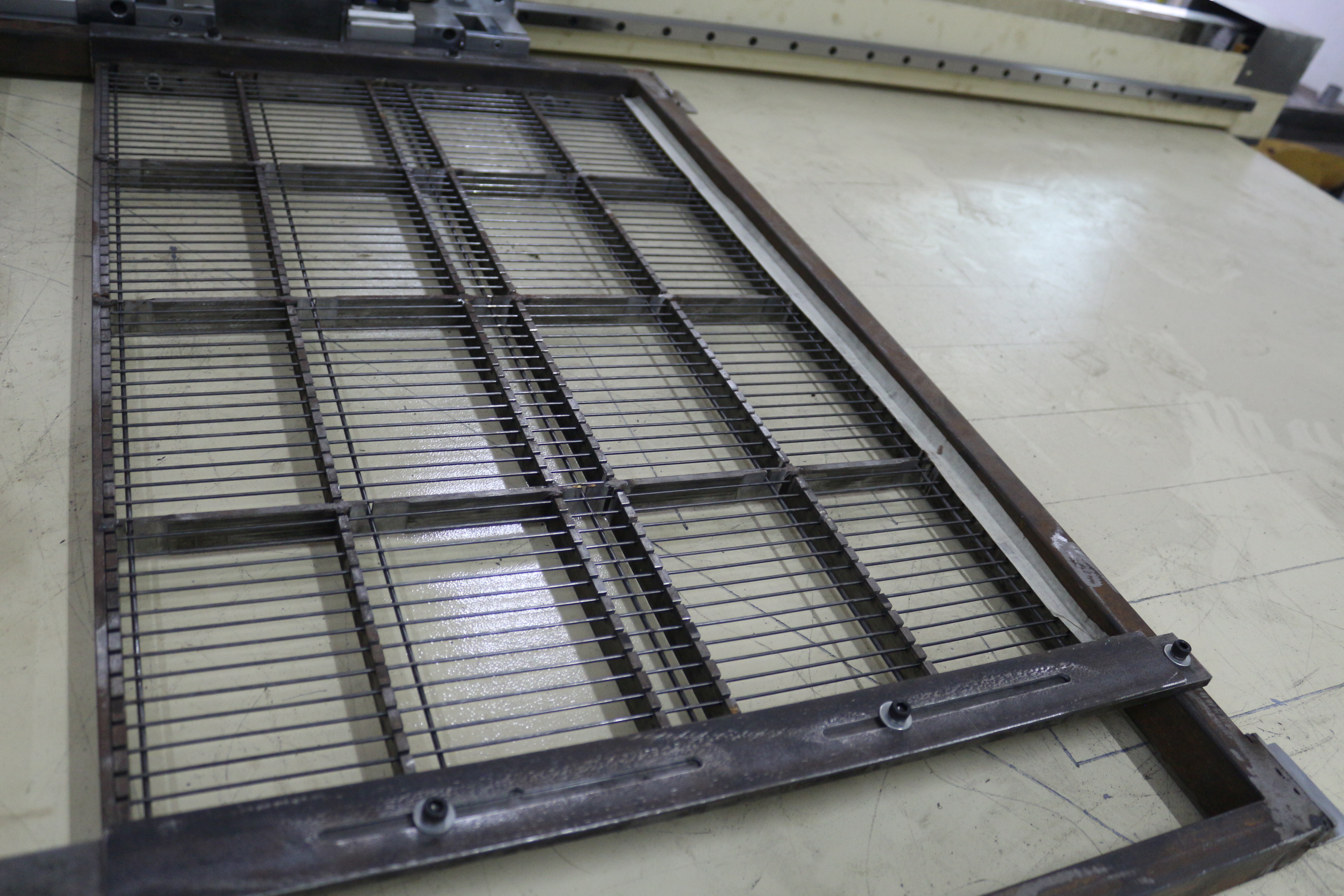 1. Semi-automatic feeding type: Manual place the precut wires into mesh mold, automatic step feeding to welding position and welding a row automatically, then automatic draw the mesh mold to next welding position and automatic welding until to finish a complete mesh, then mesh mold automatic back to origin and get out the mesh ;