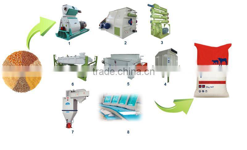 Feed Grinder →Feed Mixer → Feed Pellet Mill → Counterflow Cooler → Feed Pellets Crumbler → Feed Pellets Grading Sieve → Automatic Weighing and Packing Machine