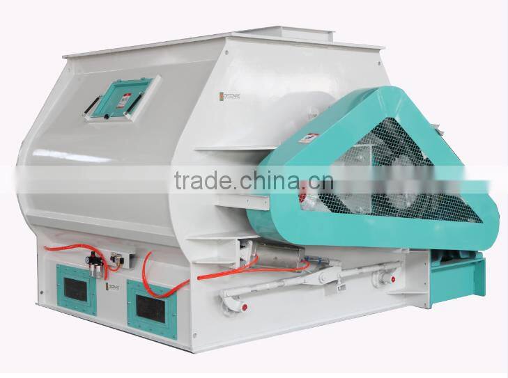 2. Feed Material Mixing Process:Mixing is considered to be one of the essential operations in feed pellet processing. Lack of proper mixing may lead to reduced diet uniformity, affecting the feed pellet quality. We supply two kinds of high efficiency feed mixers: twin-shaft mixer for mixing powdered or particle materials and screw belt mixer for mixing powdered materials. Both of them can be equipped with atomizing spraying system to add needed liquids, which can improve the feed pellet quality.