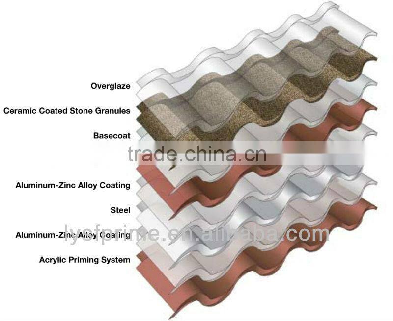 The base of colorful steel roofing tile is alumzinc sheet. The processing of the surface adopt techniques of painting and coloring at high temperature. It is environment-friendly multi-layer composite material as roof. The processing techniques and surface materials are different from those of colorful stone-coated metal roofing tiles.Any color is available as long as the color sample is offered.