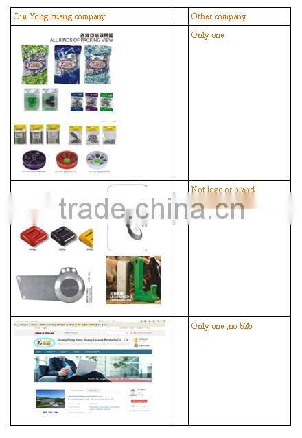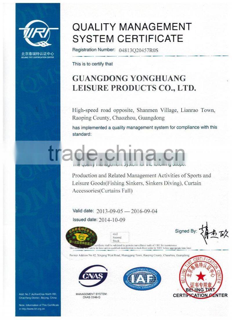 GUANG DONG YONG HUANG LEISURE PRODUCTS CO., LTD WAS FOUNDED IN 1991, IT HAS BEEN MORE THAN 20 YEARS HISTORY, THE REGISTERED CAPITAL OF 10000000 CNY. SPECIALIZING IN THE PRODUCTION OF LEISURE FISHING TACKLE (FISHING SINKER,FISHING REEL,FISHING LINE, ETC.), DIVING EQUIPMENT, CURTAINS ACCESSORIES AND OTHERS,THE ANNUAL PRODUCTION ABILITY IS ABOUT 350000000 CNY.THE COMPLETE VARIETY, GOOD QUALITY , REASONABLE PRICE , YONG HUANG COMPANY ARE FAVORED IN (EFTTEX FISHING TACKLE SHOW) EUROPEAN FISHING TACKLE EXHIBITION, THE USA FISHING TACKLE EXHIBITION (ICAST FISHING SHOW), BRAZIL FISHING TACKLE EXHIBITION (MARINER BOAT SHOW), RUSSIAN FISHING TACKLE EXHIBITION (HUNTING & FISHING IN RUSSIA), HOME TEXTILE EXHIBITION IN FRANKFURT,GERMANY (HEIMTEXTIL IN FRANKFURT), CHINA IMPORT AND EXPORT FAIR (CANTON FAIR), (BI HAI FISHING TACKLE OF TIAN JIN CITY) BI HAI FISHING TACKLE EXHIBITION OF TIANJIN, CHINA INTERNATIONAL FISHING TACKLES TRADE FAIR(CHINA FISH),SUZHOU SHANG HUA FISHING TACKLE EXHIBITION (SUZHOU SHANG HUA FISHING TACKLE SHOW) AND OTHER DOMESTIC AND FOREIGN MAJOR FISHING TACKLE EXHIBITION. WE ALSO THE CHINESE SPORT FISHING ASSOCIATION "SPECIAL PRODUCTS, OUTDOOR FISHING" FAVORITE CONSUMER PRODUCTS, "CHINA SPORTS ASSOCIATION FOR CULTURE AND EDUCATION" THE ASSOCIATION OF CERTIFIED PRODUCTS. PRODUCTS ARE SELL WELL IN THE USA, SINGAPORE, AUSTRALIA, SPAIN, THE NETHERLANDS, MALDIVES, TOBAGO, KOREA, GERMANY, FRANCE, BRITAIN, NEW ZEALAND, GREECE, JAPAN, POLAND, FINLAND, MORE THAN 60 COUNTRIES AND HONG KONG, MACAO AND TAIWAN REGIONS.