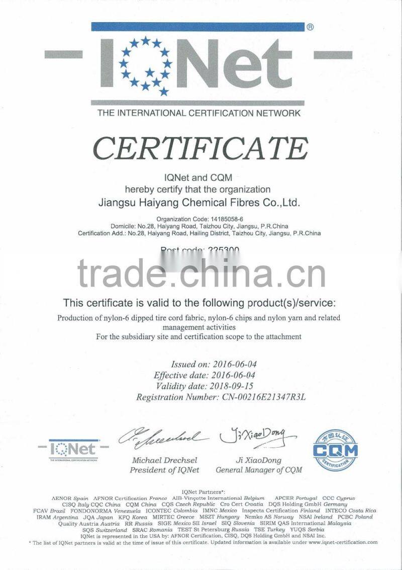 Jiangsu Haiyang Chemical Fiber Co., Ltd. has complete production process and advanced equipment including polymerization, spinning, twisting, weaving and dipping. The production capacity is 250,000 tons per year, among which are Nylon 6 dipped tyre 40,000 tons ,190,000 tons of Nylon 6 chips and 20,000 tons of High- tenacity Nylon 6 yarns and twine. The company passed through ISO9001 quality management system, ISO14001 environmental management system and ISO10012 measurement management system certification.