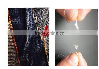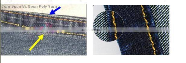 Some cusomters choose Cotton poly core spun thread use for sewing jeans,Because of the cotton fiber is good the skin,and the filament poly core have good strength.